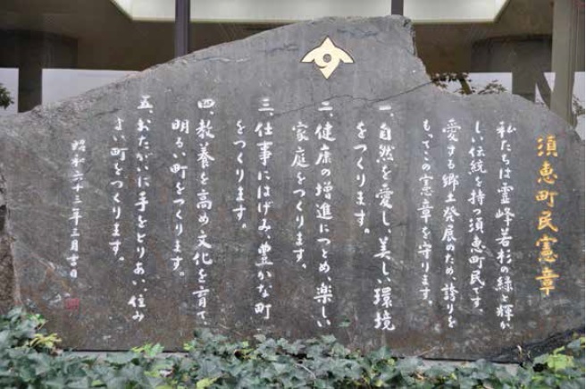 地域の課題は地域で解決する」を基本に、町民・地域・行政・企業など自立し、それぞれの立場や役割を認識するとともに、互いに手を取り、汗をかき、絆を深め、協働し、住み良い須恵町をつくるため、昭和58年、町制施行30周年記念として制定された「須恵町民憲章」を基本理念とします。