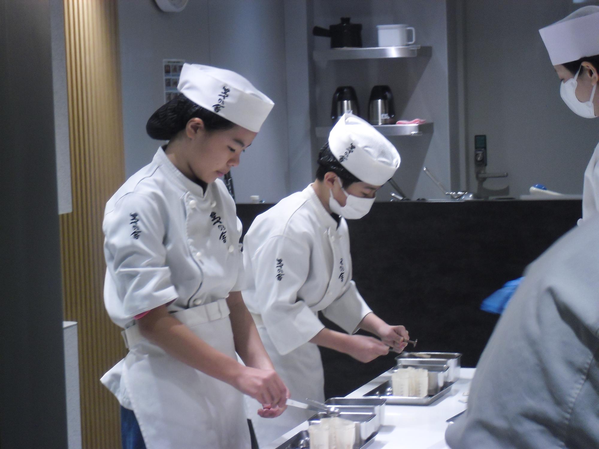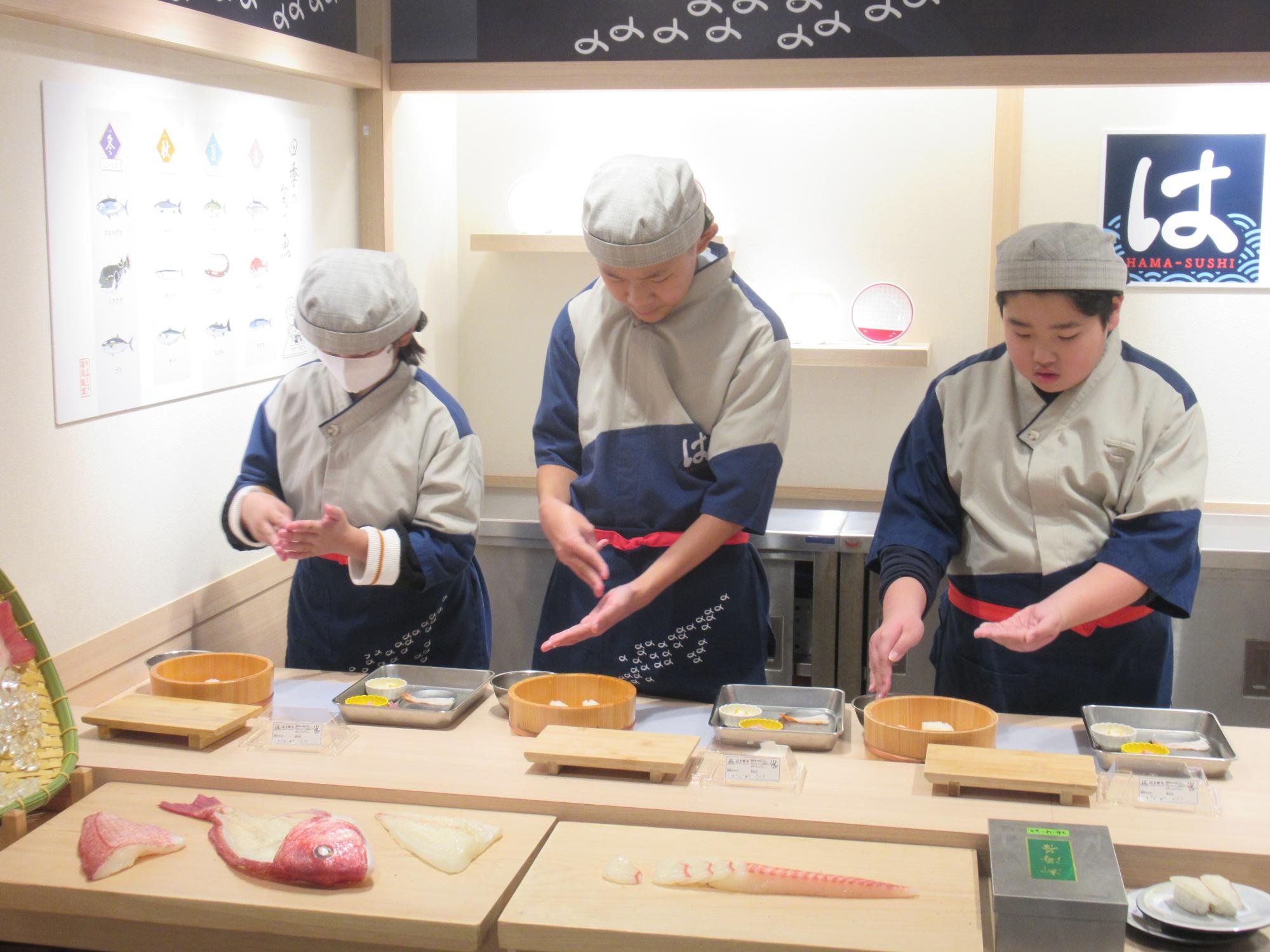 上の写真は「はま寿司」でお寿司を握っているところです。赤身と海老、軍艦を2貫の全部で4貫握り、その後、自分で食べました。寿司職人になりきって、真剣に取り組みながらも楽しんでいました。