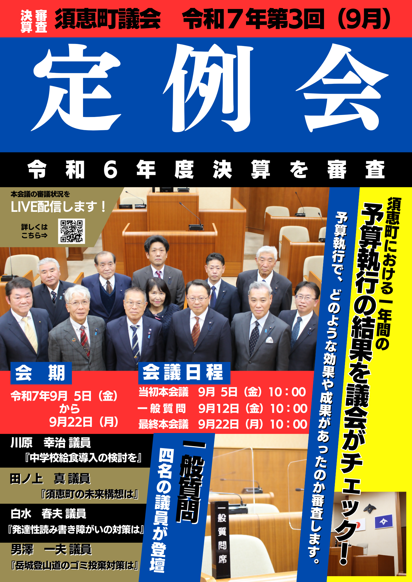 令和7年第3回須恵町議会定例会会期日程(9月5日~9月22日)