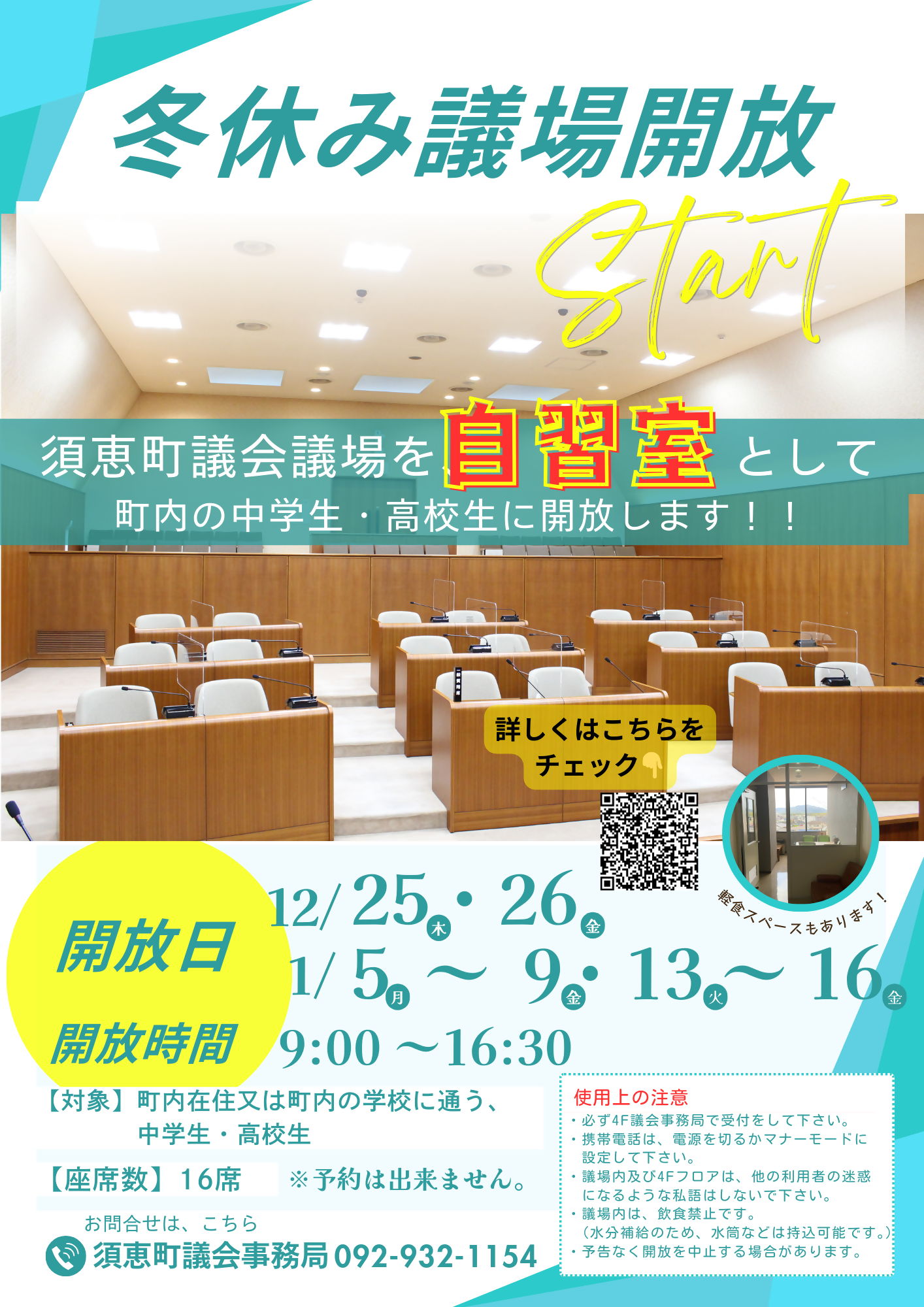須恵町議会議場を冬休みに自習室として、中高生に開放します!!